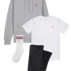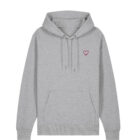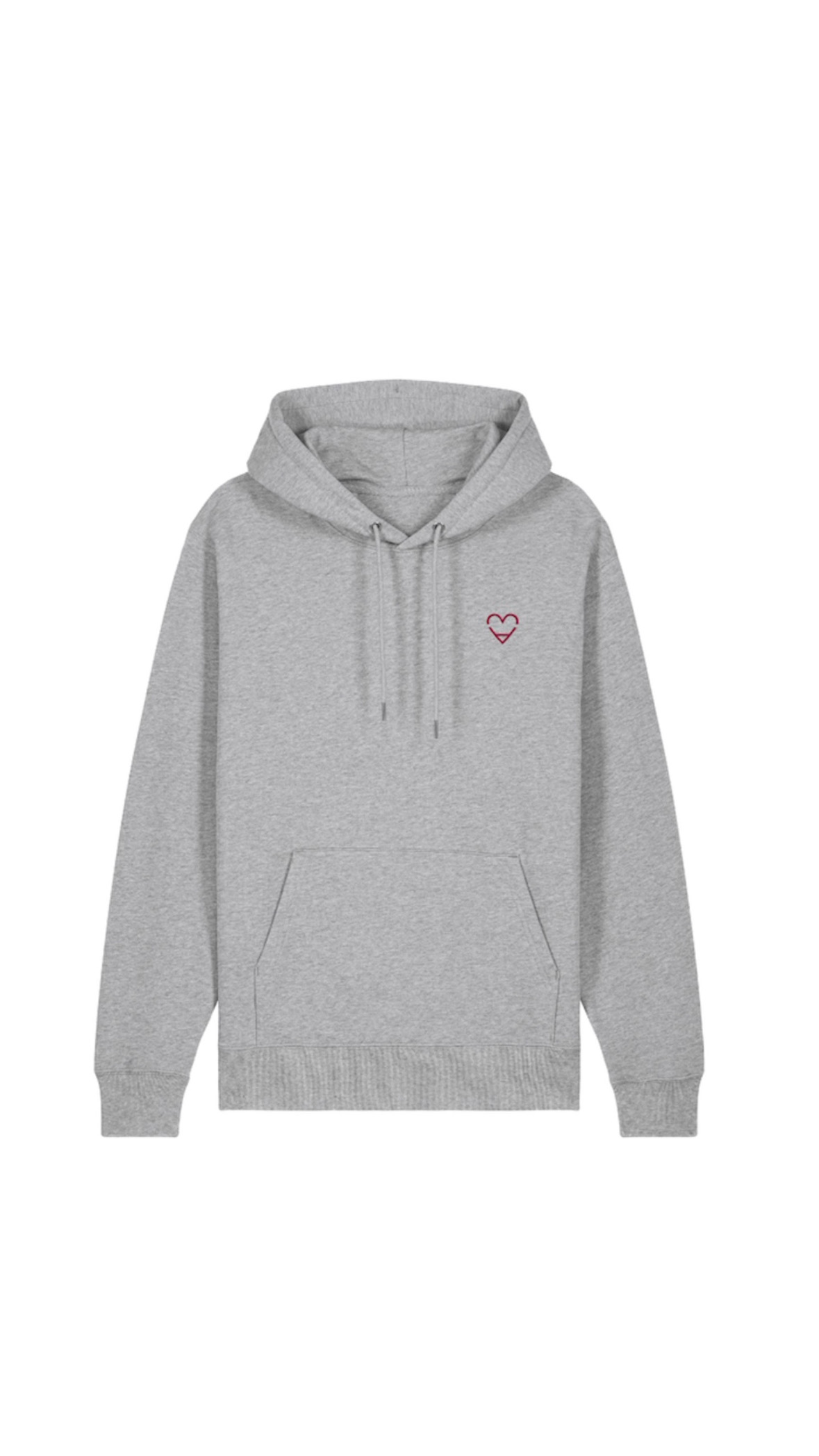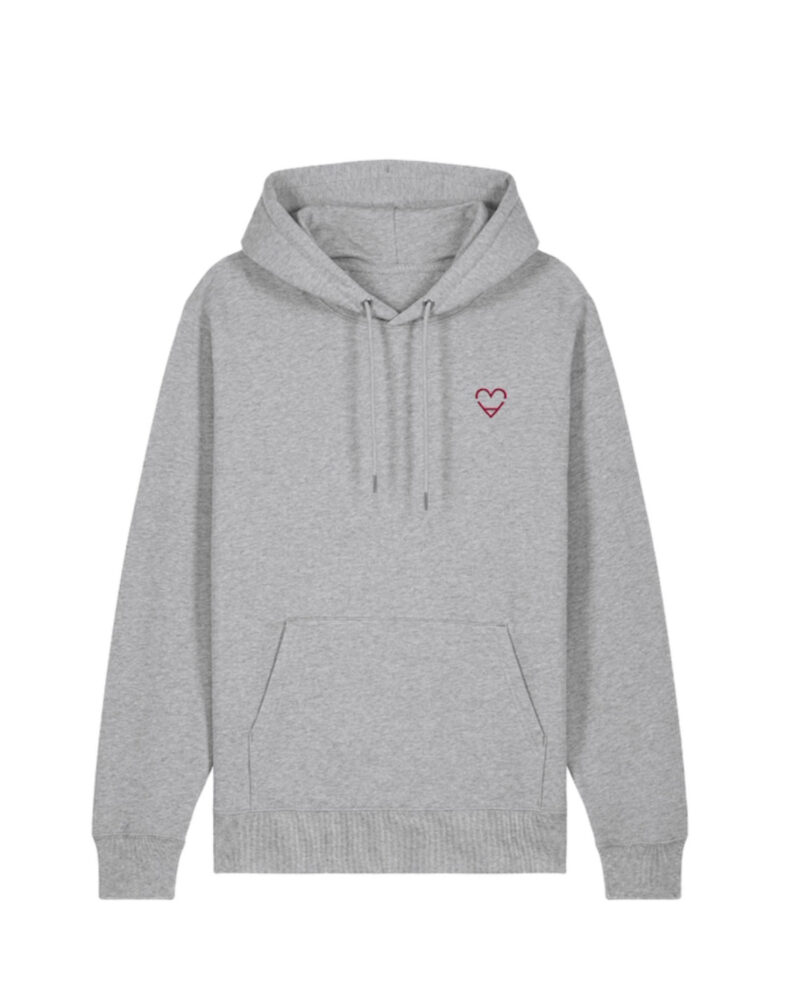 Een lichtgrijze hoodie met het Fiene.thelabel logo in donkerrrood embroidery.