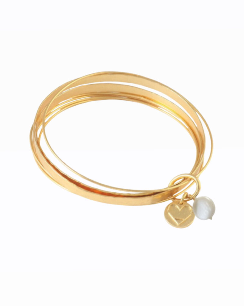 Een vaste armbandenset bestaand uit plane en gehamerde armbanden met evil eye (beschermend oogje) & fiene.thelabel coin
